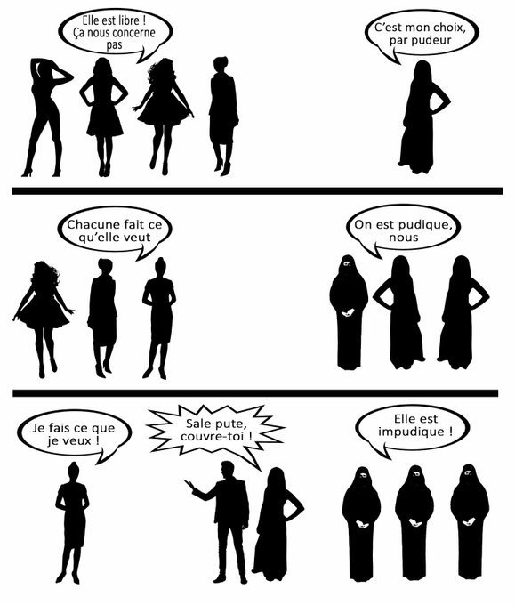 On constate que le droit de s’habiller comme on veut, donc se couvrir du voile islamique n’est pas égal au droit de le retirer. Et le droit de ne pas s’en couvrir s’efface devant la majorité couverte.