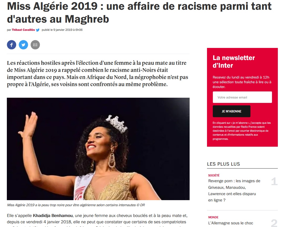 Tenez, vous savez qui n'a pas supporté l'élection d'une miss au teint foncé en 2019 ? Non, non, ce n'est pas la France, c'est l'Algérie ; pays où la négrophobie est largement répandue et assumée. (ne soyez pas feignant et allez voir cet article : Miss Algérie 2019)